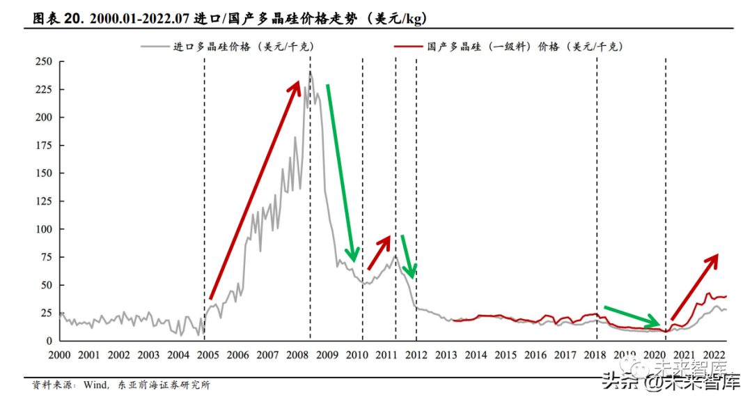 2005-2008 年——需求暴增,产能受限,价格暴涨:受欧美补贴政策刺激,光伏需求井喷,因德日技术垄断、扩产产能有限,多晶硅价格由2005 年初的 28 美元/kg 左右一路暴涨至2008 年中的241 美元/kg左右;