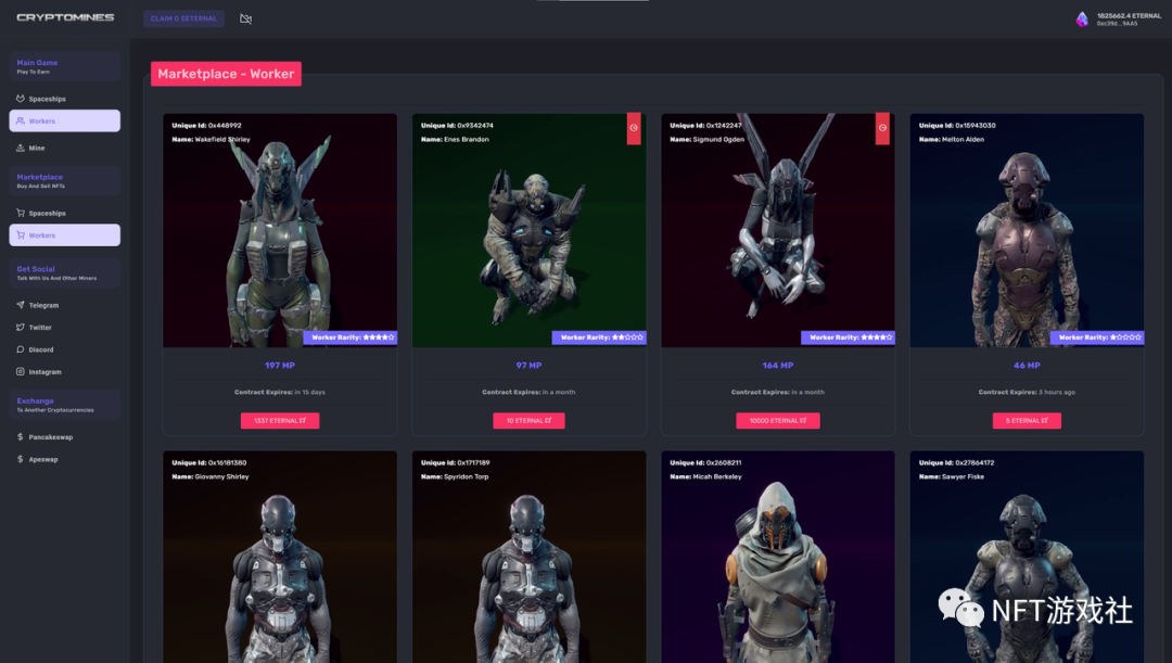 CryptoMines是一款科幻赚取NFT游戏,旨在为用户提供一种有趣的体验,收集工人和宇宙飞船,在宇宙中旅行,寻找永恒的$ETERNAL,这种矿物让他们可以过上新的一天,并在此过程中赚取一些利润。