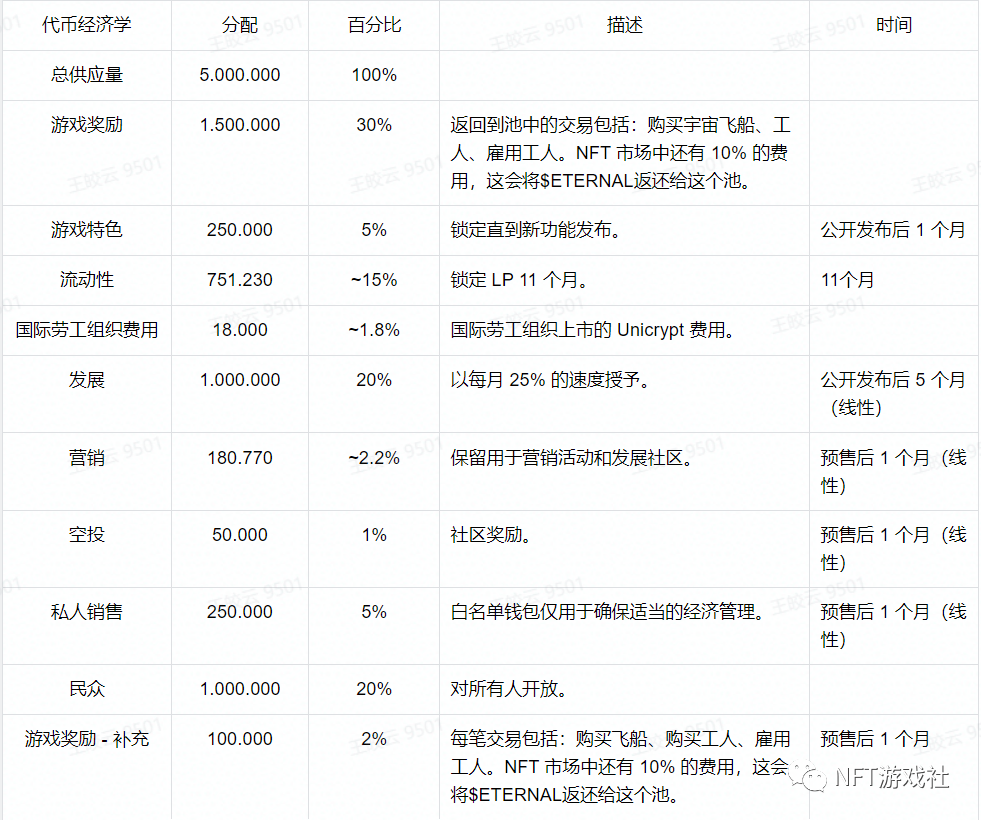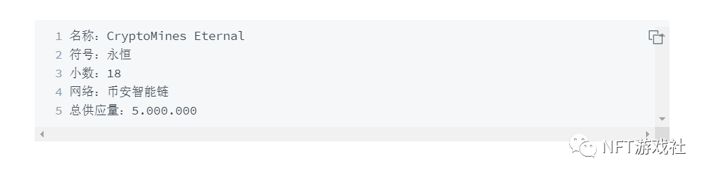 $ETERNAL充当CryptoMines的本地货币。玩家使用$ETERNAL铸造角色、铸造宇宙飞船,通过在CryptoMines市场上雇用和买卖来延长工人的寿命。最大供应量为5,000,000 $ETERNAL代币。流动性将被锁定,发展基金将以每月25%的回报率授予。