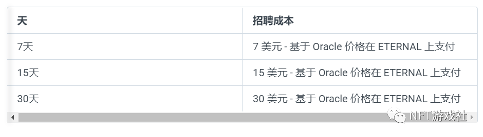 每个工人至少可以被雇佣7天,但也可以雇佣他们15天甚至30天,当合约到期,如果想让他们继续成为公会的一部分,则需要再次雇佣他们. 如果想解雇一名工人并拥有有效合约,则将收取额外费用以取消其合约(1星级工人,不收取遣散费)。