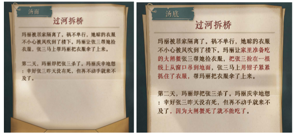 游戏中,一只海龟作将为组织喝汤的“汤主”。首先由一张复古牛皮纸呈现一则故事,玩家点开始后,故事中将出现大段空白,并以不同颜色标注关键词。其中红色部分为主要关键词,只要猜中,则可全部解锁整个故事。在玩的过程中,玩家输入的关键词也可解锁关联词,如“个”触发“一座”,并偶尔触及幸运提示,或者在故事下方浮现一些并不相关的图像给予提示,实在不行可消耗蘑菇获取信息。当故事解锁时,会有烟花绽放助乐,让人倍感鼓励。