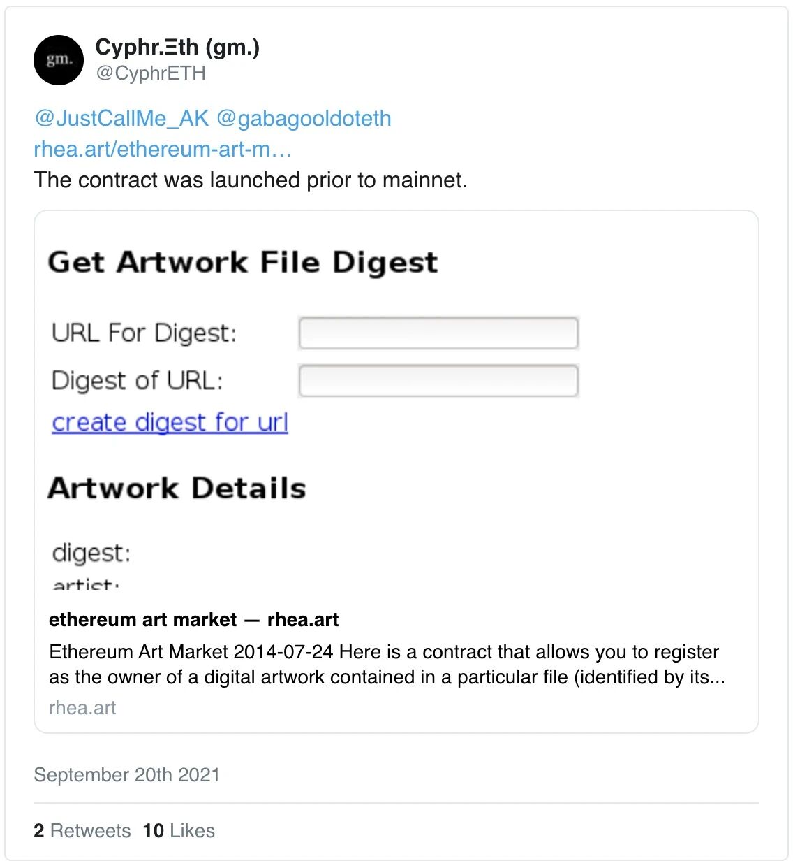 2014 年 7 月,Myers发表了“以太坊艺术市场”这篇帖子,其概述了同名的概念验证市场。
