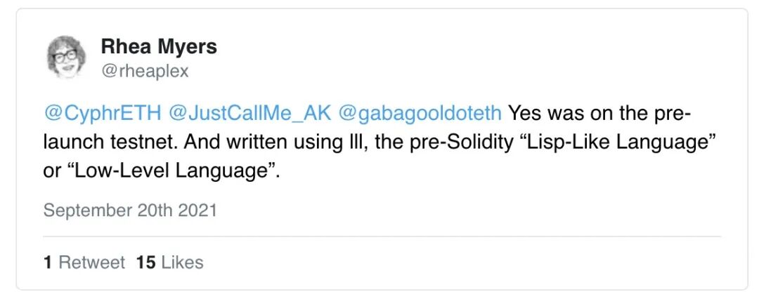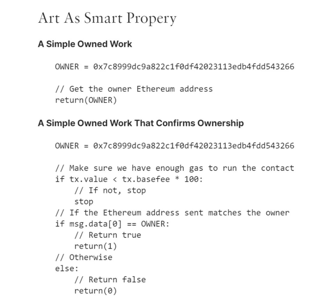 Myers 用早期的以太坊编程语言 LLL 编写的智能合约,允许用户注册为特定文件中包含的数字艺术品的所有者,并出售艺术品以换取ETH。