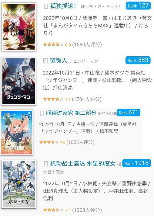 在著名评分网站Bangumi上,目前十月新番中,《孤独摇滚》的评分是8.3分,这是所有十月新番中观众评分最高的,它不仅击败了《电锯人》《间谍过家家》和《机动战士高达:水星的魔女》,甚至还击败了所有的十月新番。