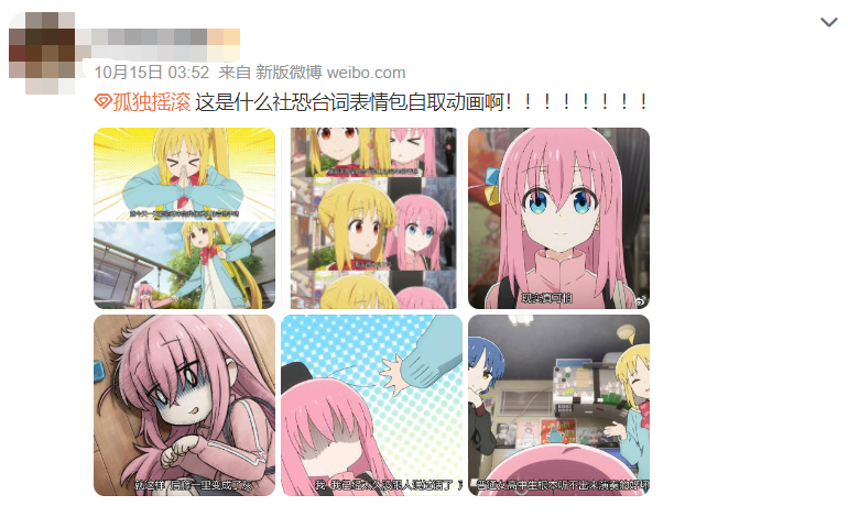 此外,不断切换作画的风格,让小孤独经常以“萌系”形象出现,也是个冲淡其社恐人设给观众带来的阴郁情绪的好方式。而这还带来了另一个好处——与小孤独有关的表情包以异常恐怖的速率增加,几乎在每一集播放之后,观众都能从剧情中截出好几个九宫格的表情包。