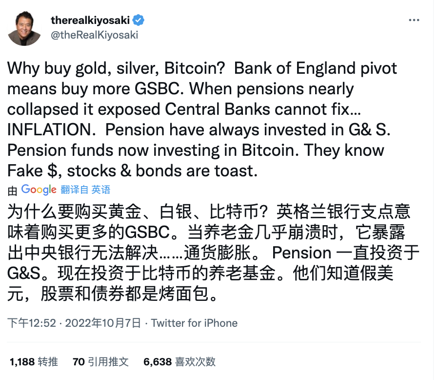 “为什么要购买黄金、白银、比特币?英格兰银行支点意味着购买更多的GSBC。当养老金几乎崩溃时,它暴露出中央银行无法解决……通货膨胀。养老基金一直投资于 G&S。养老基金现在正在投资比特币。他们知道虚假的美元、股票和债券都是烤面包。”