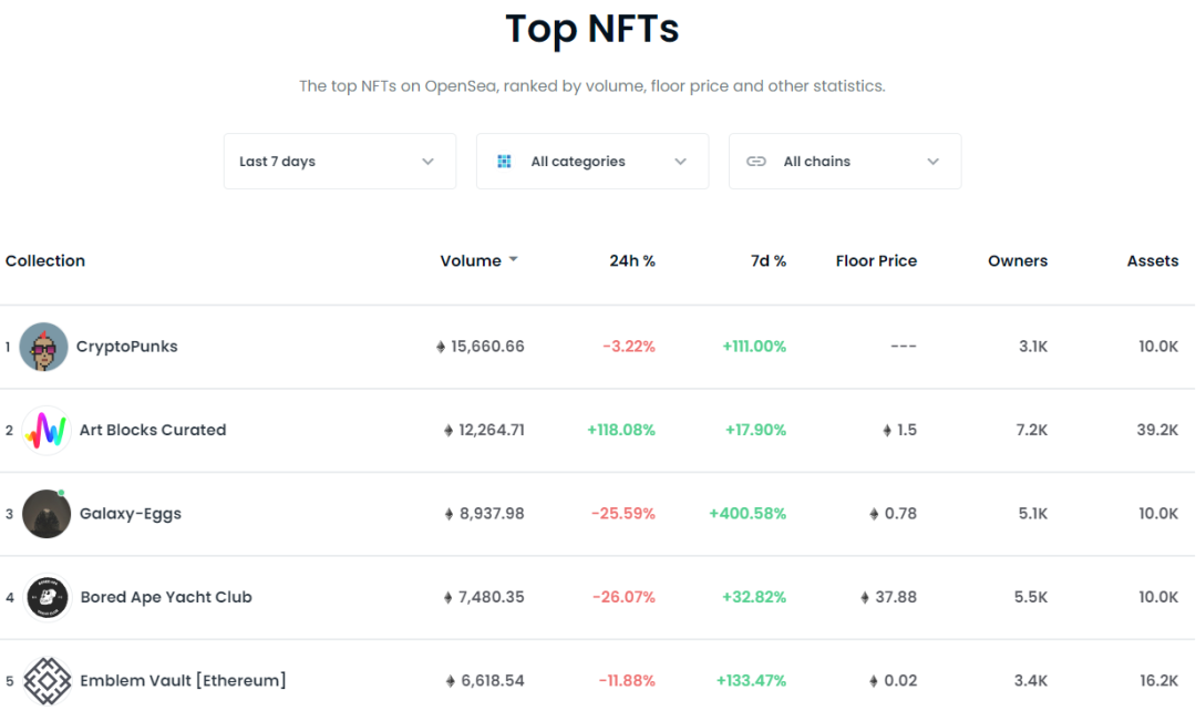 前2名没有变化,依然是Crypto Punks、Art Blocks Curated,但之后排名变为Galaxy-Eggs、Bored Ape Yacht Club和Emblem Vault。