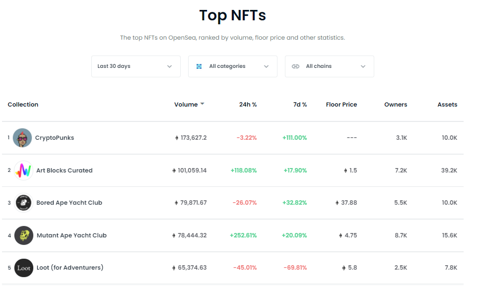 当前,根据累计交易量排,过去30天,OpenSea前五大项目分别是Crypto Punks、Art Blocks Curated、Bored Ape Yacht Club、Mutant Ape Yacht Clut和Loot。