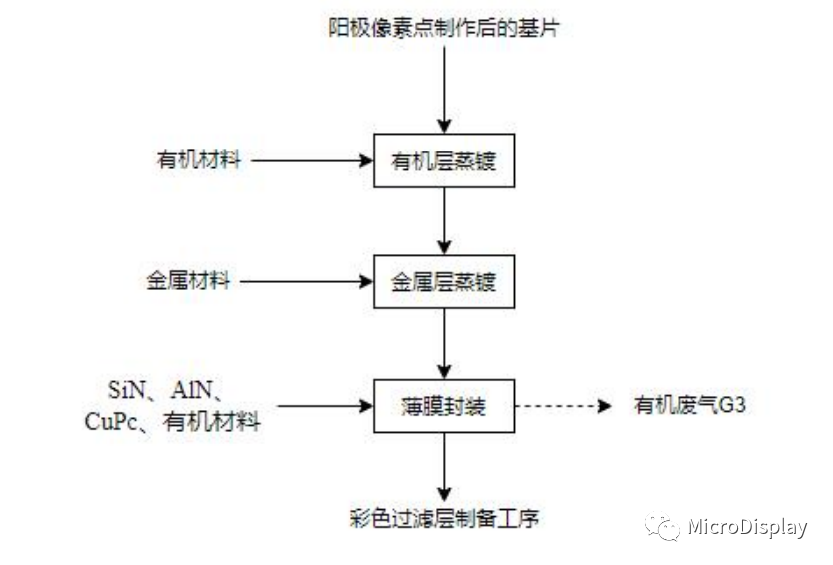采用与有机材料蒸镀同样的设备(一个蒸镀设备不同腔体)和类似工艺,被蒸发的材料为Mg、Ag等。本工序为物理过程,不产生工艺废气。