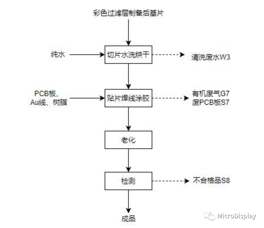 切割后的小片需要与PCB电路板贴合在一起,贴片机集成点胶、压合、固化功能;焊线采用Au线键合,在室温下使用超声波和压力使得Au线与基片内部原子扩散形成电气连接,焊接过程不产生废气。焊线完成后涂保护胶布以保护焊线的氧化和物理保护。涂胶后将半成品送入烤箱进行烘烤,在烘烤过程中有机膜里面的有机溶剂挥发形成有机废气,贴片过程中产生废PCB电路板。
