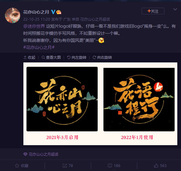 今日,《花亦山心之月》官博发文指证《迷你世界》抄袭,称其照搬模仿游戏旧logo的手写风格及整体造型。相关词条登上热搜后,引起了大量游戏玩家和网友的讨论,截至发稿前,《迷你世界》官方还未对此进行回应。