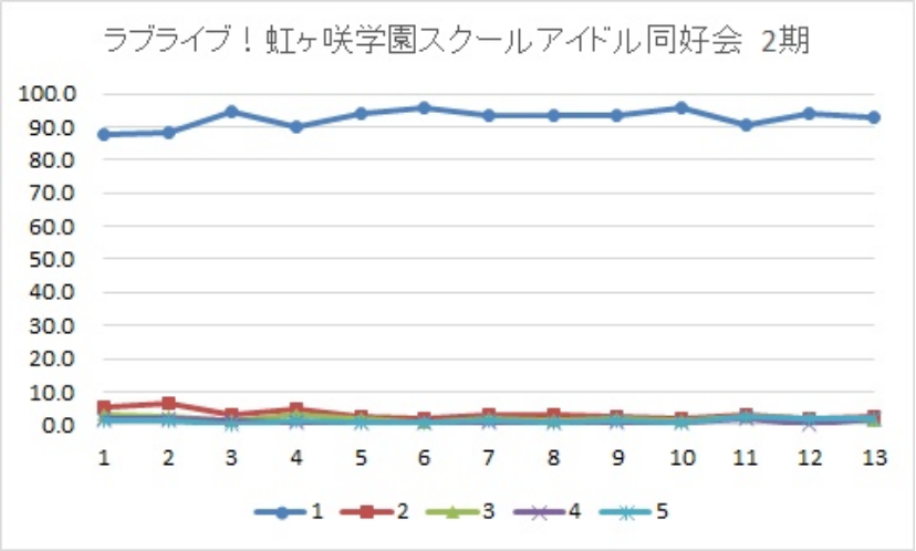 与之形成鲜明对比的是,《LoveLive!虹咲学园学园偶像同好会 第二季》全部集数的好评率,基本都维持在90%左右。