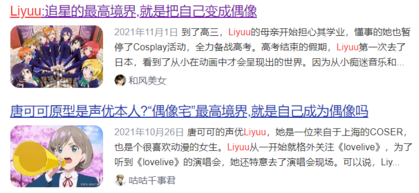 常有粉丝说黎狱就是唐可可的翻版。可可15岁时,因为喜欢校园偶像,而来到了日本;黎狱则是在2012年15岁时被同学安利了“LoveLive!”企划,从此一发不可收拾,成为了狂热粉丝,受其影响,开始练习唱跳。即便是现在,黎狱的B站首页里,仍能看见其早年翻唱μ's歌曲的视频。