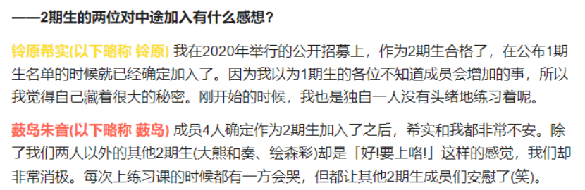 事实上,后续的采访也佐证了,二期生和一期生是一起通过的甄选,一期生一开始就听说会有新人加入,当时便感到很不安:企划才刚刚起步,仅是做好自己的事情就已经很困难了,现在还要增加新人,作为前辈真的没问题吗?