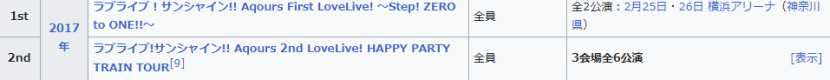 这里可以对比一下Aqours刚成立时的演出规模:整个2017年,她们也只不过举办了两次LIVE,共计8场演出。
