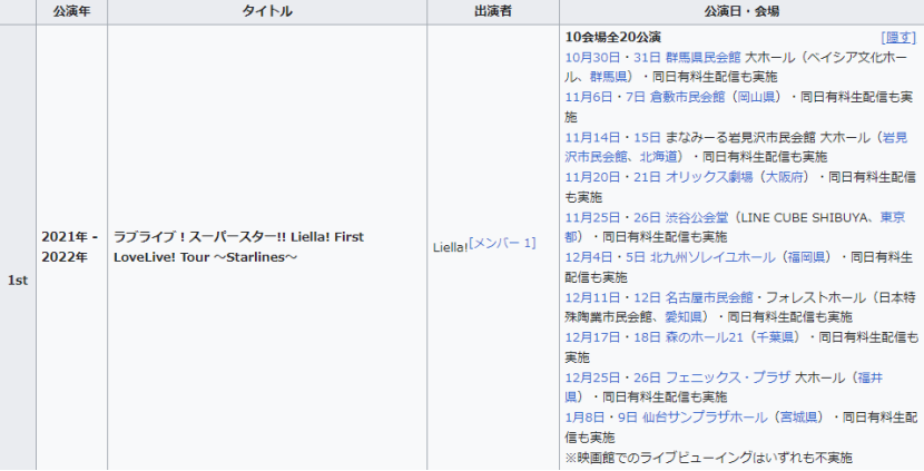 可是这时,策划开始搞事情了。动画刚刚完结,就宣布自2021年10月30日起至2022年1月8日,Liella将举办第一次巡回LIVE,转换10个会场,跑遍日本各大城市,每周举办两场演出,其中还夹杂着Aqours、虹咲学园学园偶像同好会的三团跨年演唱会,演出强度之大,堪称史无前例。