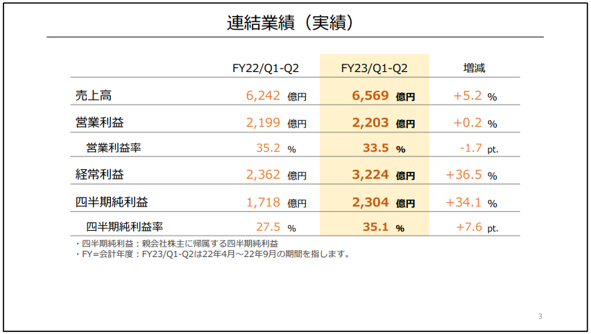 任天堂公开本财年Q1-Q2财报(4月-9月)。该季度营业额为6569亿日元,同比增长5.2%;营业利润2203亿日元,同比增长0.2%;硬件销量668万台,同比减少19.2%;软件销量9541万套,同比增长1.6%。