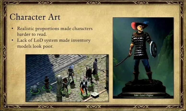 我们很早就确定了做AD&D元素,包括Elmore、Easley、Parkinson、Brom等等。我们还决定使用不那么饱和的调色板以及相对写实的武器和装备。