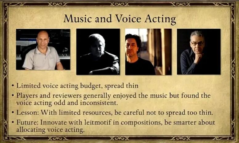 音乐和配音也很重要,在为《永恒之柱》设计音乐的时候,我们请了很多个著名的游戏作曲家,他们设计过很多经典游戏的音乐。当游戏发布的时候,玩家对游戏音乐反响不错。