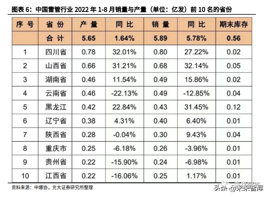 2021 年中国雷管需求大省包括四川、云南、山西、湖南、辽宁等省份,21 年销量分别为 1.04、0.89、0.85、0.65 和 0.59 亿发。2022 年 1-8 月中国雷管需求大省包括四川、山西、湖南、云南、黑龙江、 辽宁等省份。