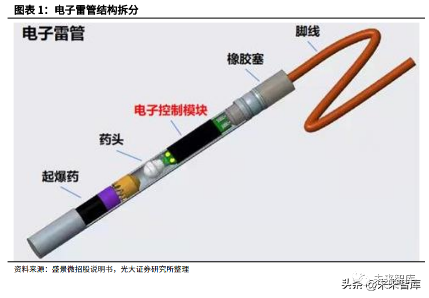 电子雷管又称数码电子雷管、数码雷管或工业数码电子雷管,即采用电子控 制模块对起爆过程进行控制的电雷管。传统工业雷管主要为导爆管雷管、工业电 雷管,通过内置的化学延期药剂实现延期。
