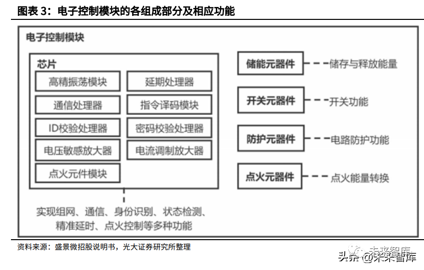 电子控制模块是电子雷管的核心组件,电子雷管通过电子控制模块实现可靠 通信、身份识别、状态检测、精准延时、起爆控制等关键功能。同时,电子控制 模块能够内置密码和身份码,使得电子雷管起爆系统具有安全管控功能,行业主 管部门已建立电子雷管的安全管控机制,能够实现电子雷管在生产、存储、流通 和使用各环节的闭环管控,特别是通过密码与授权控制起爆的功能有效杜绝了涉 爆危险品的非法使用,有利于提高社会公共安全水平。典型的电子控制模块主要由芯片、储能元器件、开关元器件、防护元器件及 点火元器件组成。电子控制模块获取起爆控制器提供的电源,可执行身份识别、 在线检测、授时延时、起爆控制等多种指令。起爆时,芯片接收到指令并通过身 份识别后,按照指令进行高精度延期,延期结束后控制电子开关导通,储能元器 件的能量通过开关元器件释放至点火元器件上完成电子雷管起爆。