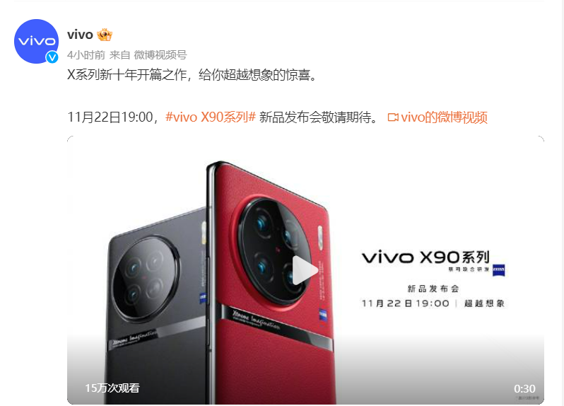 今日,vivo官方发布消息,vivo将在11月22日举行发布会,届时会发布vivo X90系列等一系列产品。此次vivo X90采用和爆料相似的外观设计,在X80的基础上进行一些修改,并加上金属饰条提升辨识度。![]()