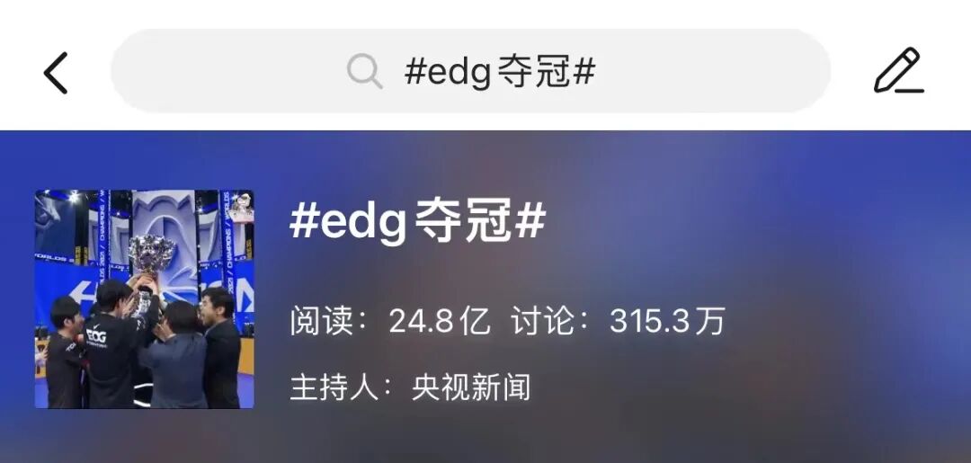 比赛的精彩程度自然不必多说,当晚,#EDG夺冠#相关的话题就迅速登顶了微博热搜,并拿下了超20亿的阅读量。随后,央视新闻相关资讯的点赞量更是迅速破百万。
