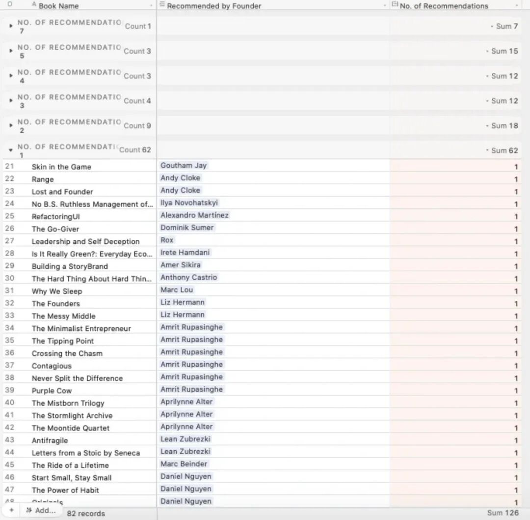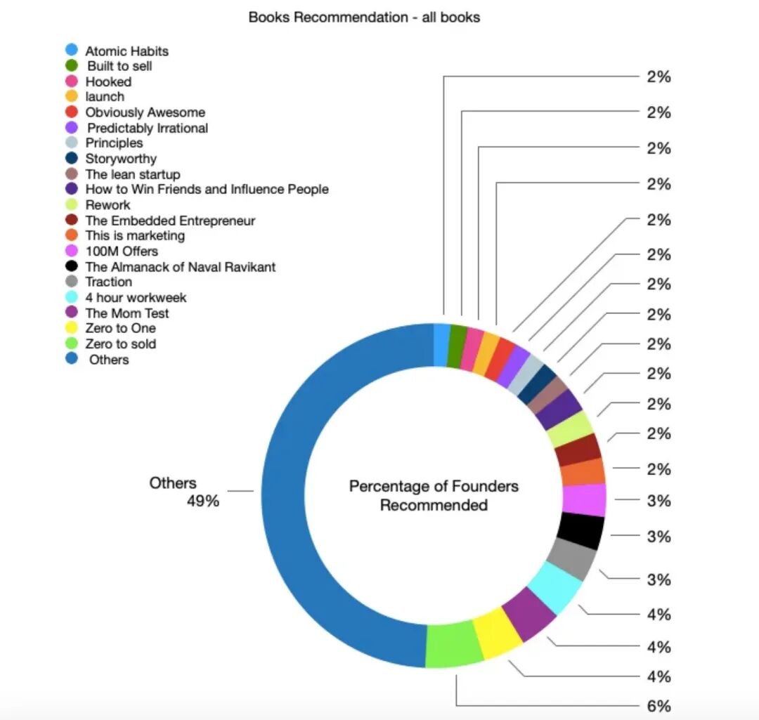 我们从82位不同的创始人那里收到了82份独特的书籍推荐!一些创始人推荐了多本书籍,还有一些人根本不喜欢看书。