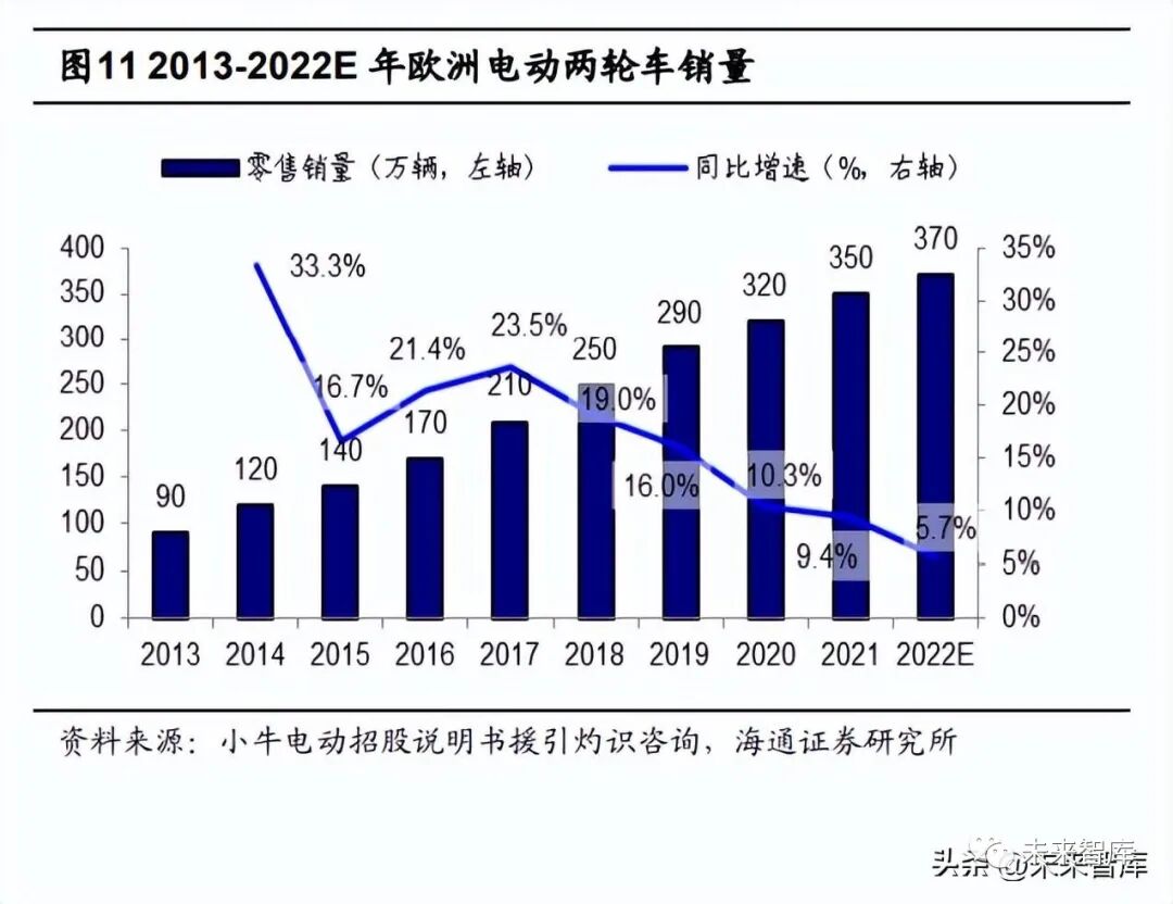 海外市场电动两轮车异军突起,需求快速放量。政策补贴带动欧洲市场销量稳步增长。根据小牛电动招股书援引灼识咨询的数据, 2021 年欧洲电动两轮车市场规模预计达到 69 亿欧元,销量预计达到 350 万辆。2013-2022 年欧洲电动两轮车市场规模的年均复合增长率预计可达到 19.6%,销量年均 复合增长率预计为 17%,呈现稳步增长态势。我们认为欧洲电动两轮车市场增长的原因 是:1)政策支持,包括对电踏车、电动自行车的补贴政策以及对摩托车的限制政策。