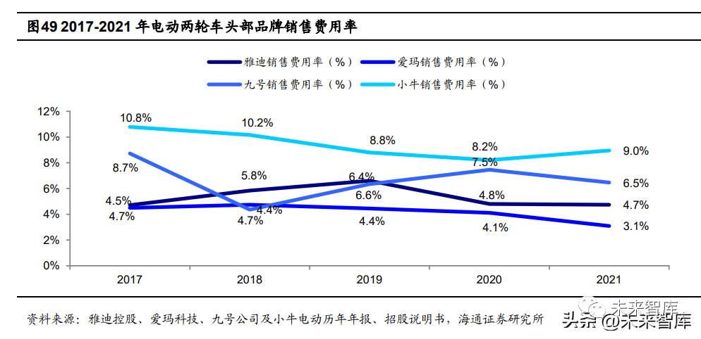 电动两轮车的龙头品牌在品牌力建设方面都非常重视。2017-2021 年九号公司的销 售费用率稳定在 4%以上,小牛的销售费用率在 8%-11%之间,而爱玛和雅迪的销售费 用率则分别稳定在 3%-7%左右。