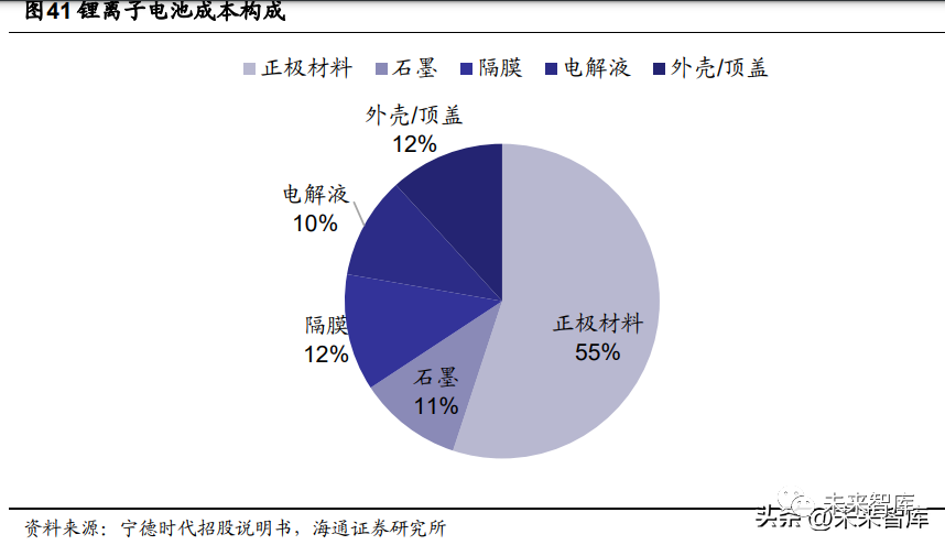 锂离子电池生产制造上游环节有正极材料、负极材料、隔膜、电解液等。负极 材料以天然石墨和人造石墨为主,对提高电池容量、循环性能等方面起重要作 用。正极材料最常用的为钴酸锂、锰酸锂、磷酸铁锂和三元材料,其性能直接 影响锂离子电池性能。从锂离子电池的成本结构来看,正极材料成本占比最大, 2017 年达到 55.06%,因此我们认为,制作正极材料的四种金属原料镍、钴、 锰、锂的价格对锂离子电池行业影响较大。根据 Wind 经济数据库中,硫酸镍 7 月均价为 3.69 万元/吨,较 3 月份高点下降 24.39%,环比下降 12.77%;电解 钴 7 月均价为 35.43 万元/吨,较 3 月份高点下降 37.14%,环比下降 15.56%;硫酸锰 7 月均价为 0.75 万元/吨,较 4 月份高点下降 28.57%,环比下降 10.71%;磷酸铁锂 7 月均价为 15.50 万元/吨,较 3 月份高点下降 7.19%,与 6 月持平。