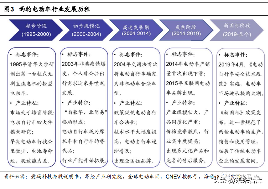 国内电动两轮车市场突破存量约束,目前进入快速放量阶段。我国两轮电动车行业 从无到有,再到超千亿的市场规模,二十余年间已取得显著发展,其具体发展历程大致 可分五个阶段:1.起步阶段(1995-2000 年):1995 年清华大学研制出第一台柱式无刷直流电机的 轻型电动车,标志着我国电动车产业的开端。这一阶段为早期实验性生产阶段,主要是 对电动车的电器四大件(电机、蓄电池、充电器和控制器)关键技术的摸索研究。在技 术层面,早期电动车行驶公里数少、电池寿命短、爬坡能力差且容易磨损;在市场方面, 行业仍处于培育阶段,进入市场的厂家与商家并不多。