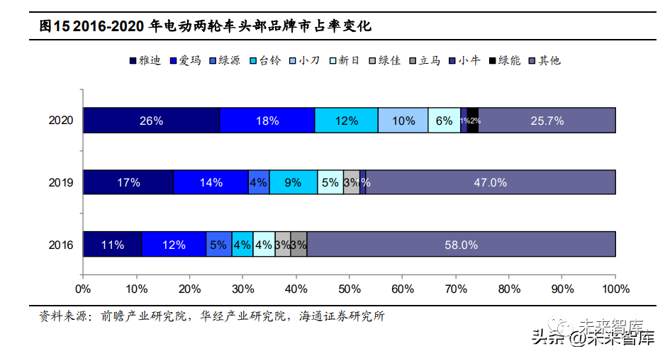行业格局加速集中。电动两轮车行业内企业主要有雅迪、爱玛和台铃等传统电动两 轮车品牌,以及小牛、九号等新势力电动两轮车品牌。随着电动两轮车行业竞争激烈化, 部分自主化品牌在行业发展中退出市场,根据共研网的数据,行业内企业数量从 2013 年共 2000 家缩减至 2019 年共 110 家。根据前瞻产业研究院的数据,2016 年国内电动 两轮车行业集中度较为分散,头部品牌市场份额 CR5 仅占 36%,其中市场份额排名前 三的分别是爱玛、雅迪和绿源,市占率分别为 12%、11%、5%。2019 年电动两轮车行 业有所集中,头部品牌市场份额 CR5 占 49%,其中雅迪反超爱玛成为行业第一,市场 份额前三分别是雅迪、爱玛和台铃,市占率分别为 17%、14%、9%,雅迪、爱玛与行 业内其他品牌的差距有所扩大。而到 2020 年,电动两轮车行业进一步集中,根据华经 产业研究院整理的数据,2020 年头部品牌市场份额 CR3 已占据 55.4%,雅迪和爱玛与 其他品牌的差距进一步扩大,市场份额前三的雅迪、爱玛和台铃的市占率分别为 25.6%、 17.9%、11.9%。行业内 CR5 市场份额从 2016 年 36%提升到 2020 年 70.9%,行业集 中度加速提升,形成了以雅迪、爱玛为中心的竞争格局。