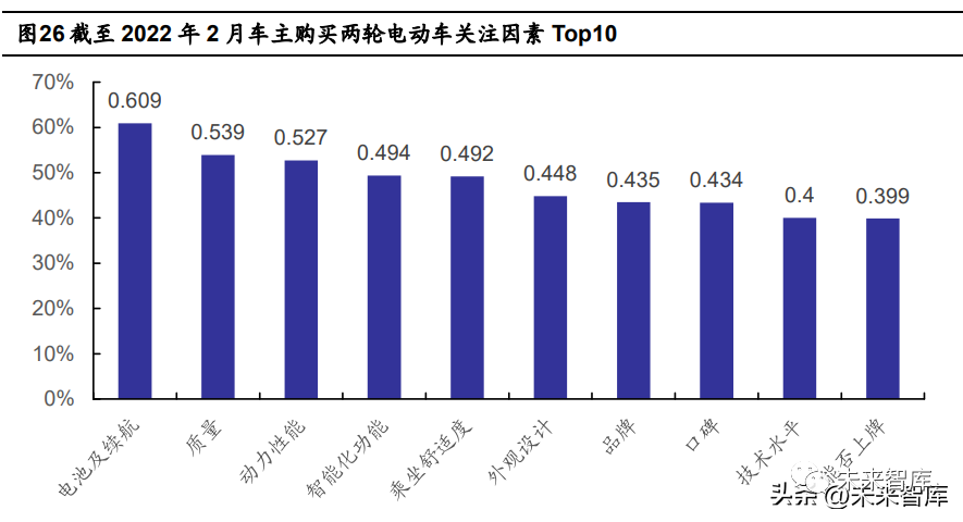 传统两轮车产品消费中,消费者较为重视产品的性价比,龙头向产业链上游布局增 强成本控制力、核心部件自控力。产品品质方面,根据鲁大师腾讯号援引艾瑞咨询于 2022 年进行的车主购买两轮电动车关注因素调查显示,消费者较为重视电池及续航(60.9%)、 质量(53.9%)、动力性能(52.7%)、智能化(49.4%)等指标,其中最受重视的电池及续航、动力性能等因素主要受到产品电池、电机性能的影响。根据爱玛科技招股说明书, 电动两轮车的成本结构中,电池、电机分别占据总成本的 22.11%、11.12%,是产品成 本中占比最高的项目,龙头企业具有较强的规模效应、产业链自控能力,成本控制能力 较为突出。