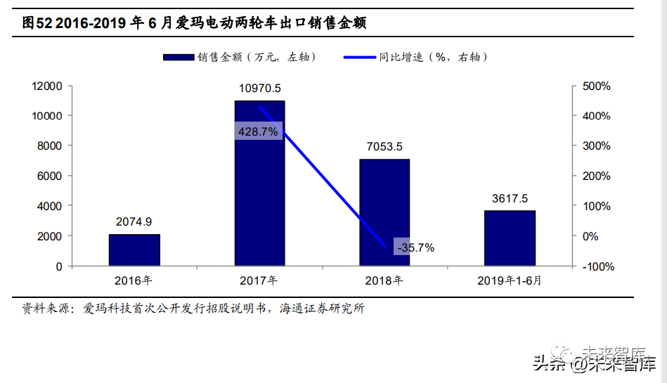 爱玛于 2015 年正式进军欧洲市场,在瑞士开设旗舰店。2018 年,爱玛入驻“中国东盟新能源车生产基地”,借助“一带一路”的地域优势向东南亚市场扩张。爱玛与德国博 世电机公司合作,进一步扩大了国际影响力。爱玛在海外市场的主要销售模式为 OEM 生产模式。2016 年到 2018 年,爱玛电动两轮车出口销售金额从 2074.9 万元增长至 7053.5 万元,年均复合增长率高达 84.38%,其中 2017 年出口金额高达 10970.5 万元。
