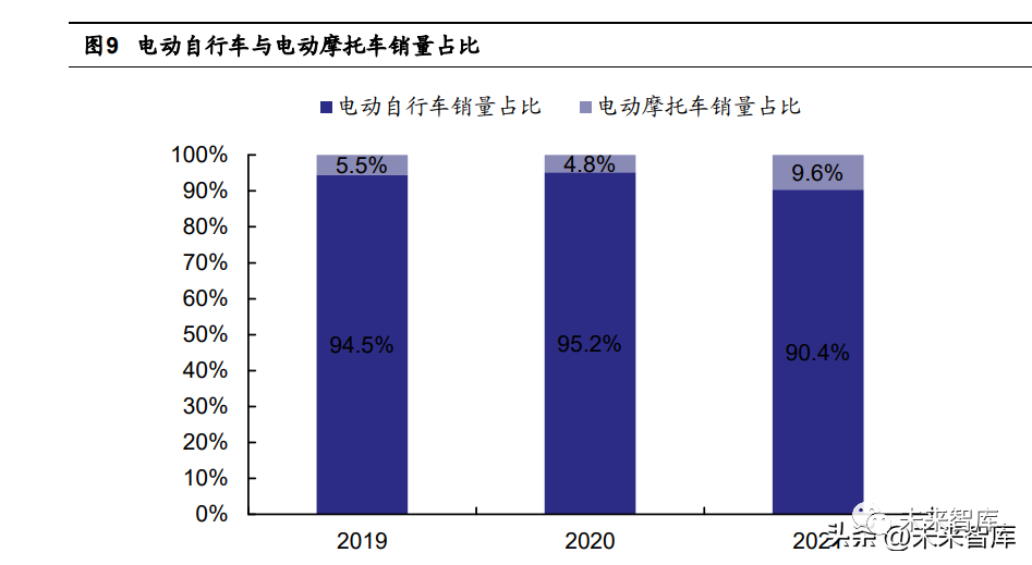 展望未来,我们认为行业高成长性仍有望持续,主要体现在电动自行车需求放量。从销量占比情况可以看出,2021 年电动摩托车在两轮电动车行业中销量占比仅有 9.6%。究其原因,我们认为从电动自行车、电轻摩、电摩的区分来看,电动自行车属于非机动 车,无需驾驶证,相较电动摩托车重量更轻、车速更低,且便捷实惠,适合短途出行需 求;而摩托车属于机动车,驾驶前需要考取驾驶证,且受限于“禁摩令”,在大城市出行 较为不便,价格也相对更高,市场消费需求有限。