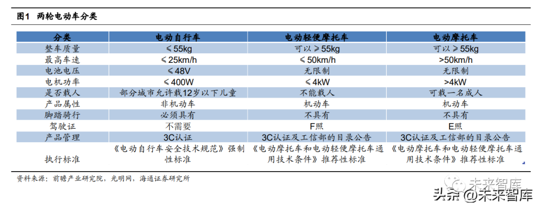 两轮电动车是指具有电池、电机、控制器等关键零部件,并以蓄电池作为能量来源、 电机转化电能为运动机械能、控制器实现运动方向、运动速度等控制的两轮车辆。根据 《电动自行车安全技术规范》,两轮电动车可划分为三类:电动自行车、电动轻便摩托 车、电动摩托车。其中,电动自行车是指车载蓄电池作为辅助能源,具有脚踏骑行能力, 能实现电助动或/和电驱动功能的两轮自行车;电动轻便摩托车是指由电力驱动,其最 高设计车速不大于 50km/h,其电机的最大连续额定功率总和不大于 4kW 的摩托车;电 动摩托车是指由电力驱动,其最高设计车速大于 50km/h,其电机的最大连续额定功率 总和大于 4kW 的摩托车。