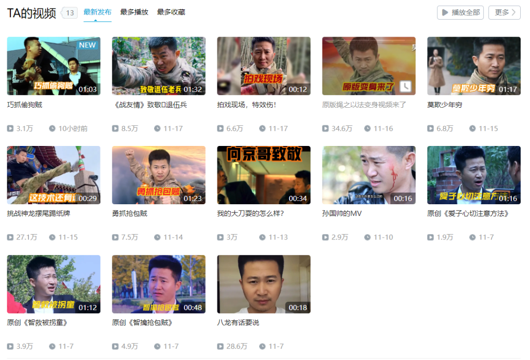 事实上,孙国帅最早发布这些带有变身桥段的视频,是在今年的二月。当时,他只在三个视频中表演过这段变身,而在之后的视频里,他又尝试了不同的主题形式,比如穿着那身迷彩服致敬军人,或者表演一些诸如双节棍开瓶盖这样的功夫特技。显然,他并没有预料到,这样一段廉价的变身特效,会在B站成为无数网友取乐的素材。