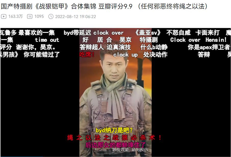 如此激进的艺术表达形式,自然也引发了人们对昊京的争论。有人认为他是正能量的代表,也有人认为他只是在借吴京和《战狼》的热度,恰流量饭。部分观众将昊京的视频形容为“依托答辩”,并搬运至B站,进行疯狂的整活和二创。