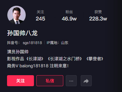 昊京在抖音的账号ID叫“孙国帅八龙”,孙国帅是他的真名,而他之所以不叫“一龙”“二龙”,是因为他在电影《长津湖》中,不光是吴京所饰演的“伍千里”的替身,而且还出演了一个出场戏份不多的,名叫“巴龙”的角色。