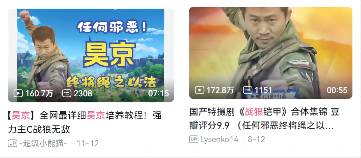 目前,B站上能搜到的有关“战狠”“昊京”的视频中,播放量最多的视频,是由B站UP主“Lysenko14”制作的《国产特摄剧〈战狠铠甲〉合体集锦 豆瓣评分9.9(任何邪恶终将绳之以法)》。这条视频发布于8月,到目前为止已经有了172.9万次播放,1500条评论。其次是UP主“-超级小能猫-”制作的《【昊京】全网最详细昊京培养教程!强力主C战狼无敌》,也取得了160万的播放和3000多条评论。
