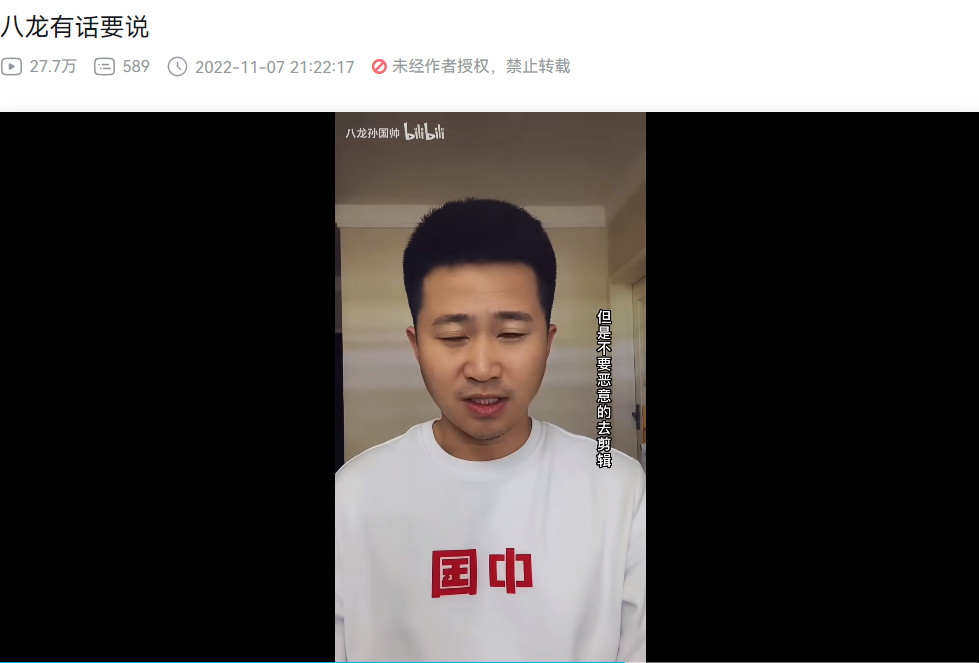 直到最近几个月,他的二创视频在B站上越来越多,越来越火,并逐渐成了一种抽象表达,孙国帅才意识到,自己在其他平台上火了。于是,在11月7日这天,他注册了自己的B站账号,并发布视频称,希望网友们不要对自己的视频进行恶意剪辑,要多多支持正能量的作品。