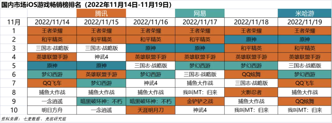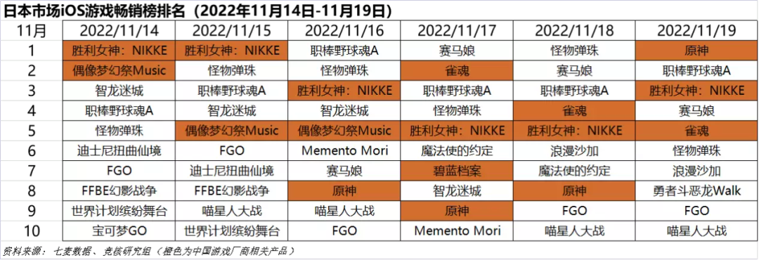 2022年11月14日—11月19日日本iOS游戏类畅销榜中,米哈游《原神》、乐元素《偶像梦幻祭》、鹰角网络《明日方舟》、腾讯游戏《胜利女神:NIKKE》、悠星网络《雀魂》、《碧蓝档案》进入榜单。