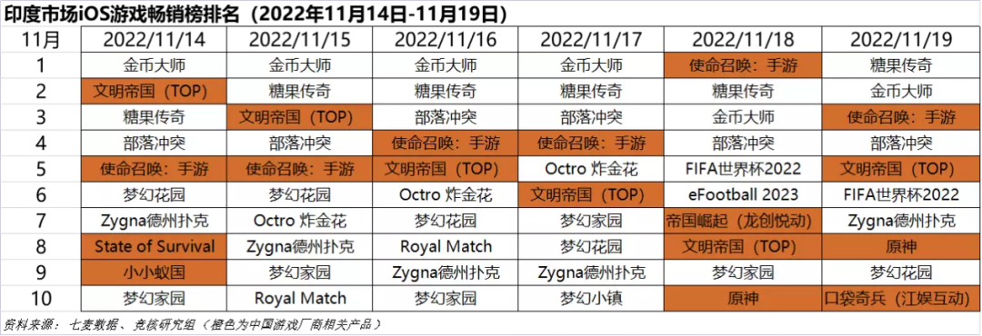 2022年11月14日—11月19日印度iOS游戏类畅销榜中,国产SLG游戏排名有所下滑,仅TOP Games《文明帝国》稳定保持在前十名中,下滑的主要原因是《糖果传奇》、《金币大师》、《部落冲突》以及Playrix旗下游戏表现极为稳定,加上世界杯临近,部分足球游戏排名有所上涨导致。