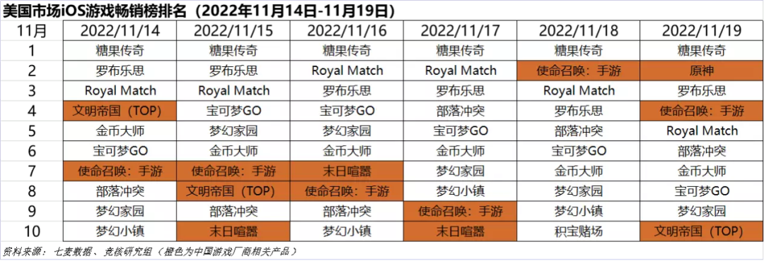 2022年11月14日—11月19日美国iOS游戏类畅销榜中,TOP GAMES《文明帝国》、腾讯游戏《使命召唤手游》、三七互娱《末日喧嚣》、米哈游《原神》均有进入榜单。