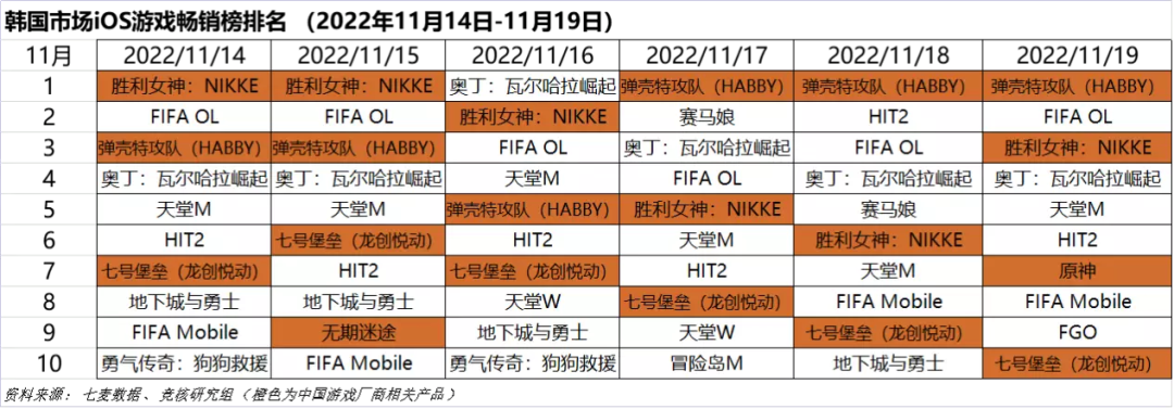 2022年11月14日—11月19日韩国iOS游戏类畅销榜中,HABBY《弹壳特攻队》、米哈游《原神》、腾讯游戏《胜利女神:NIKKE》、龙创悦动《七号堡垒Last Fortress》、自意网络《无期迷途》本周进入Top10。
