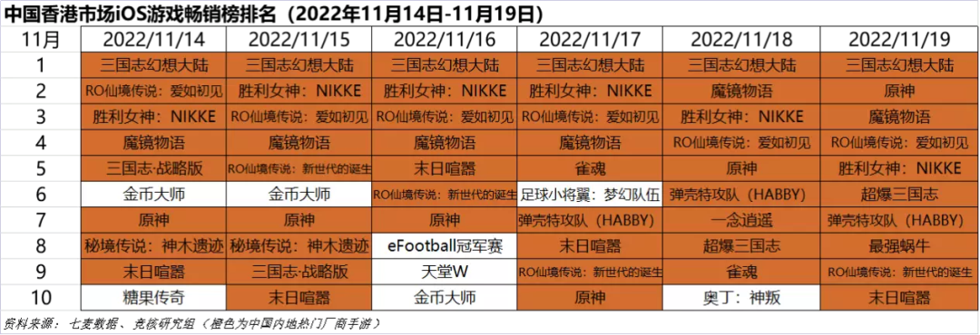 中国香港市场2022年11月14日—11月19日iOS游戏类畅销榜中,《三国志幻想大陆》霸榜一周,可见三国IP在港台地区的号召力。