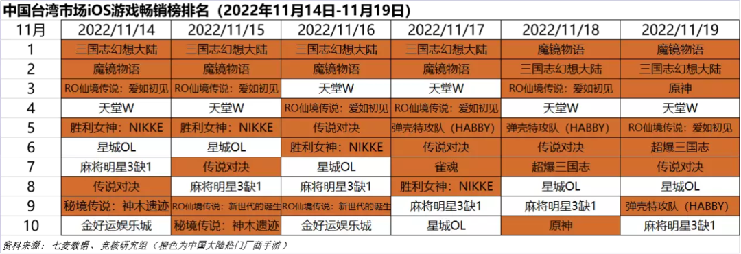 中国台湾市场2022年11月14日—11月19日iOS游戏类畅销榜中,《三国志幻想大陆》登顶四天,《魔镜物语》登顶两天。
