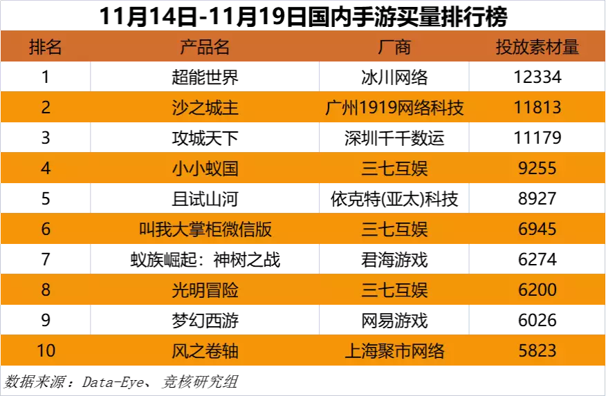 Data-Eye数据显示,2022年11月14日—11月19日国内中重度手游买量榜单中,冰川网络《超能世界》持续领跑榜单。